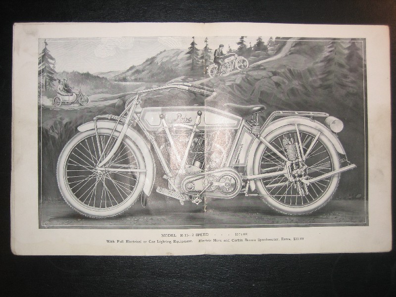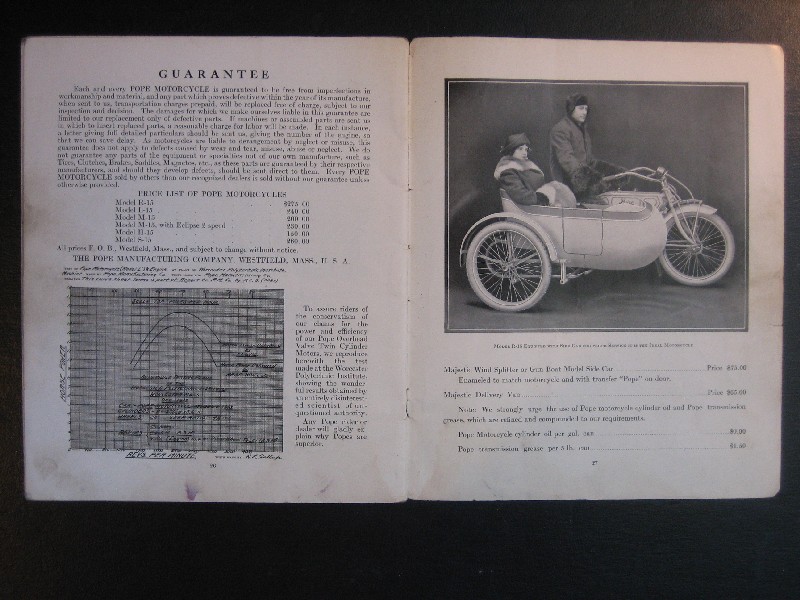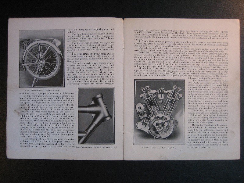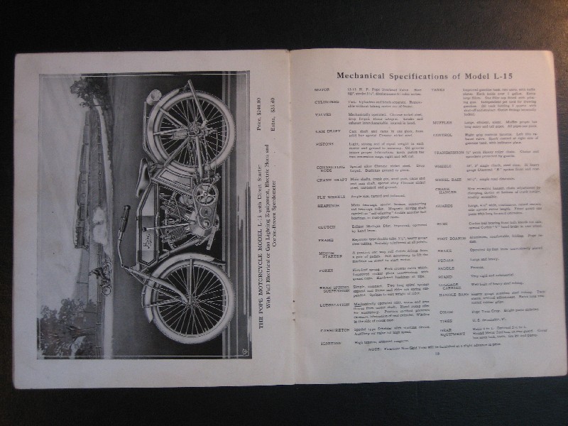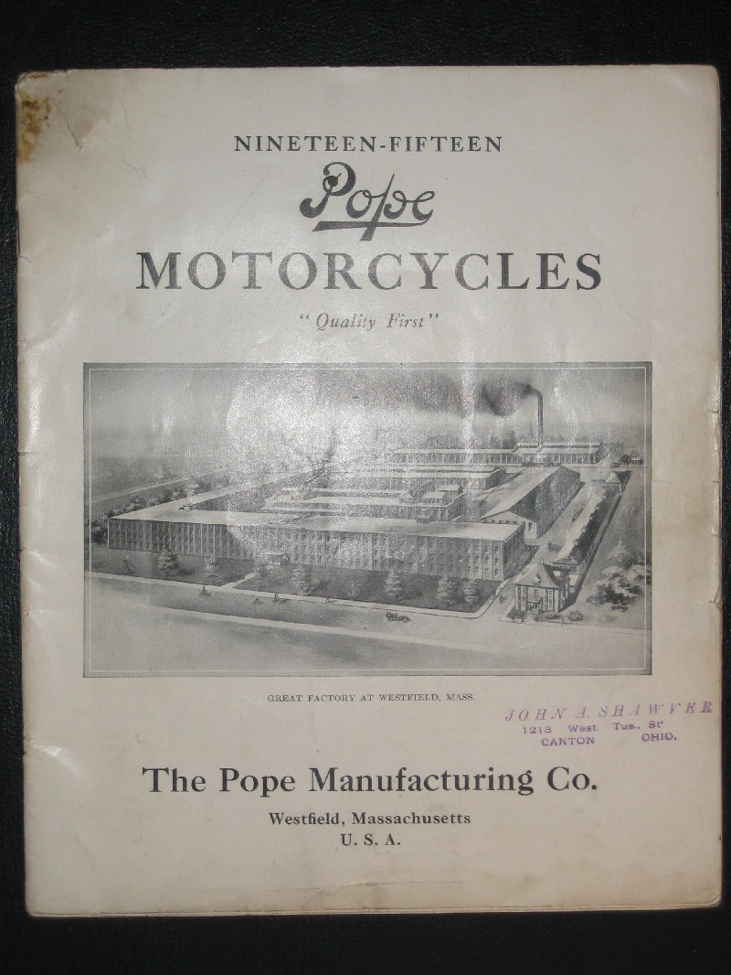 This is an original 1915 Pope motorcycle sales catalog. It is in good condition with no torn or dog-eared pages. It has some evidence of use. The center page is loose from the staples. The asking price is $850